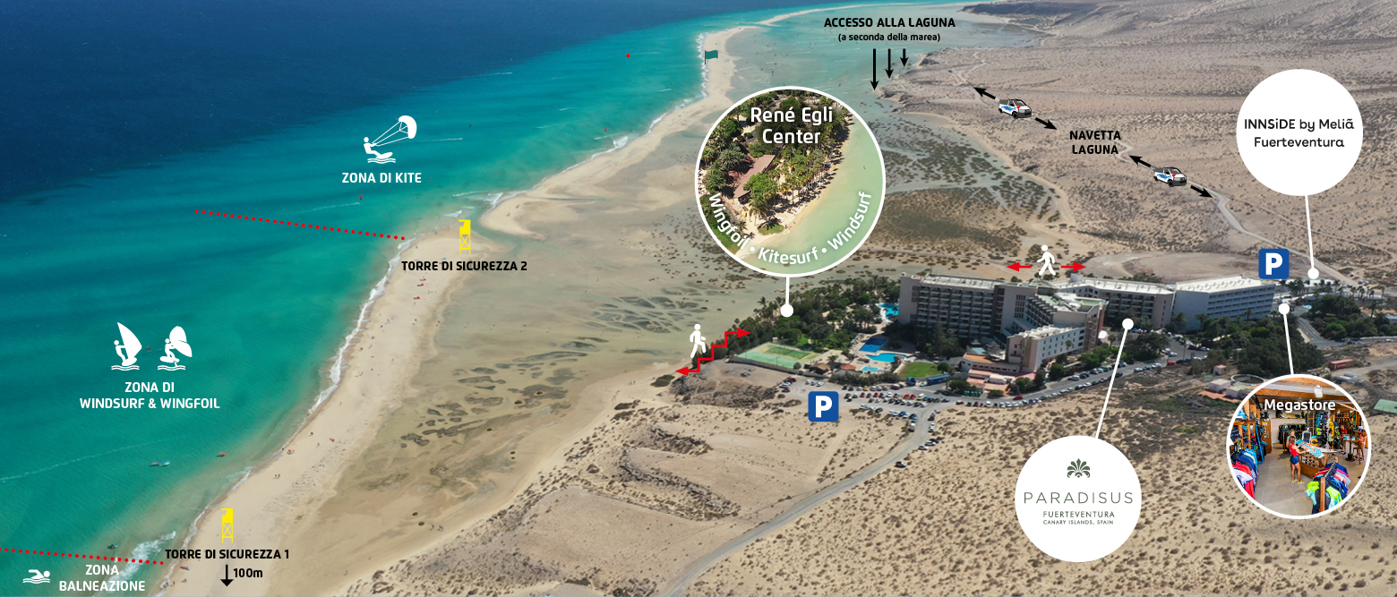 • Estesa zona surf con eccellenti condizioni per freeride, freestyle, slalom e velocità